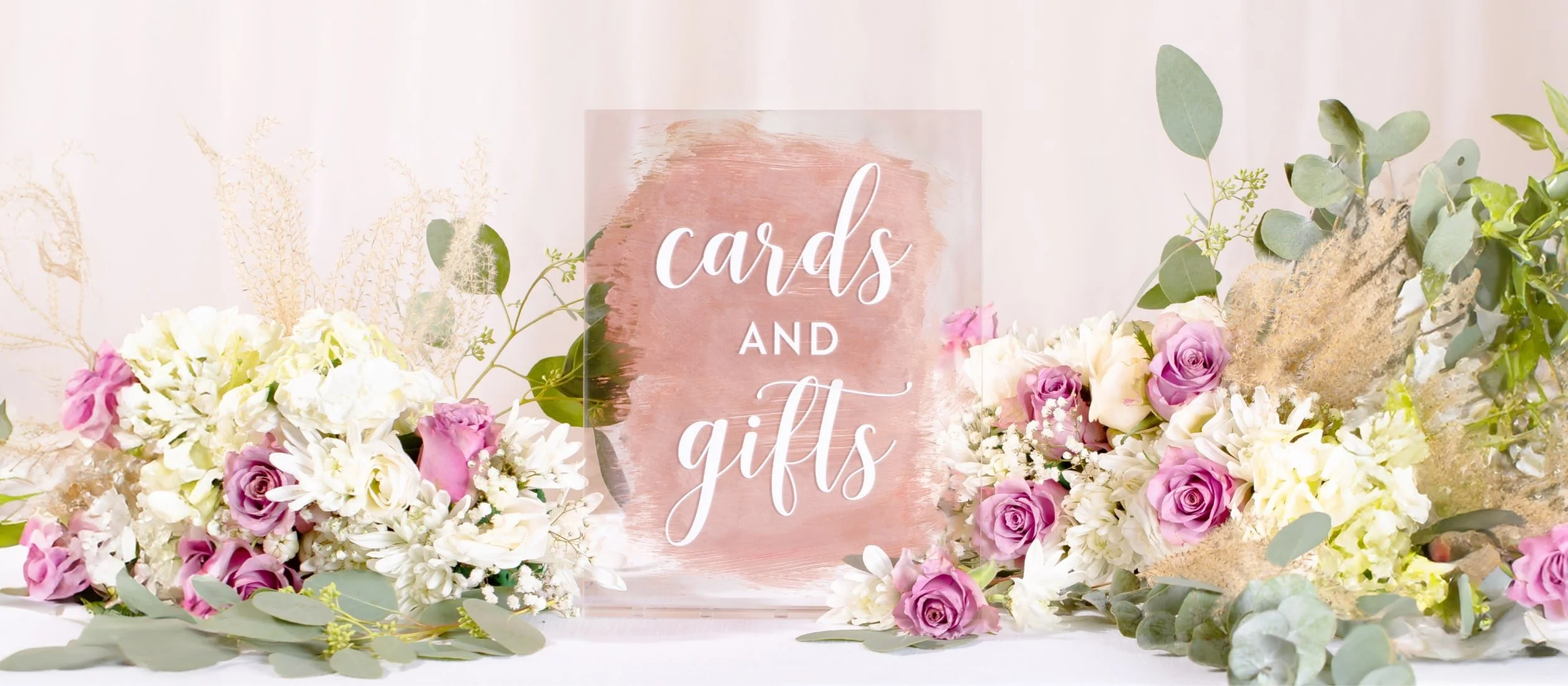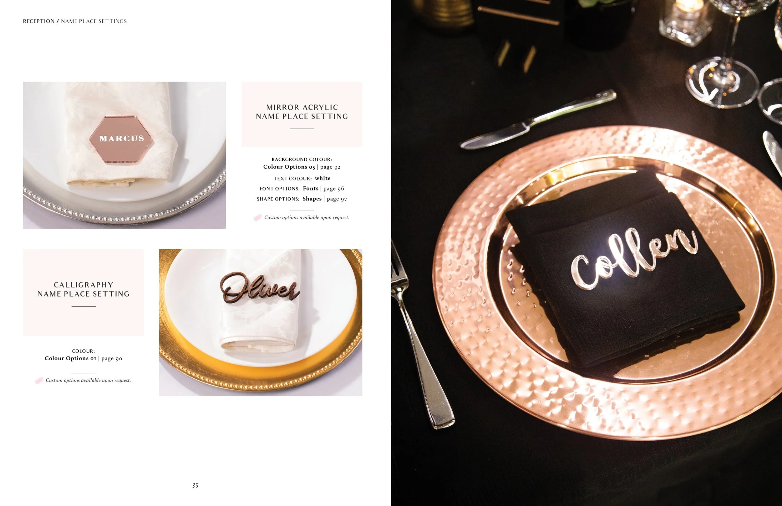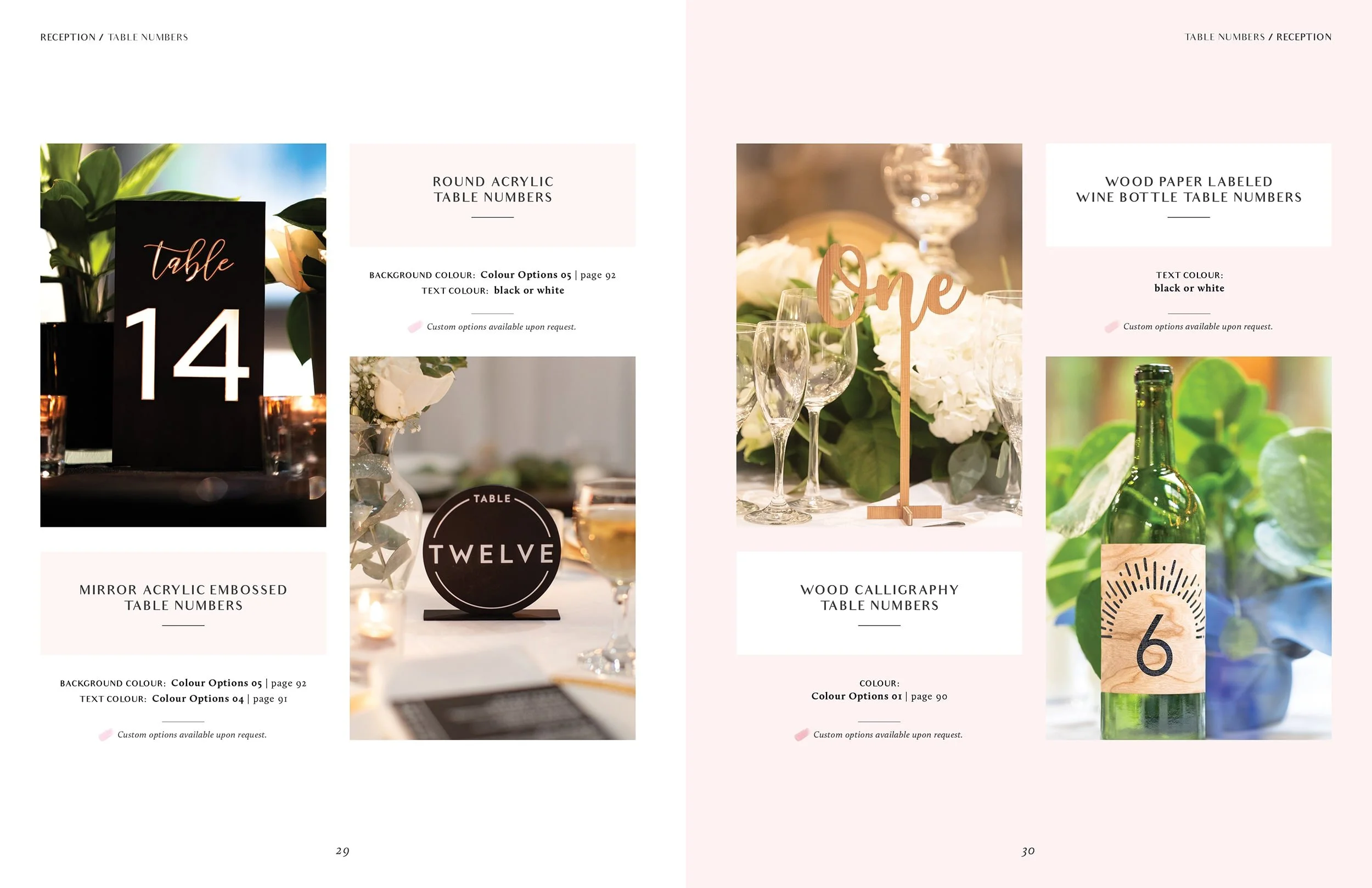 The catalogue is structured around essential wedding components: ceremony, reception, and bridal party. Each section showcases materials and finishes for various product types, like the welcome sign, allowing customers to customize with fonts, colours, and shapes detailed in the appendices.